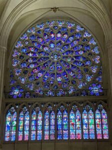 Encadré par deux guides, le groupe de 35 personnes a pu déambuler avec les nombreux touristes présents dans les allées de la cathédrale pour découvrir les splendeurs de ce monument et l’immense travail réalisé par les différents artisans du bâtiment durant ces 6 années écoulées. Chacun a pu admirer les magnifiques détails des 3 portes de la cathédrale, l’orgue remis en état après son démontage intégral suite à l’incendie qui l’avait rendu inutilisable. Les regards se sont arrêtés sur les magnifiques vitraux de la Rosace de la Vierge et les colonnes sculptées qui soutiennent cet édifice majestueux.